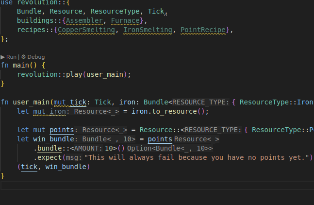 3. A playthrough of this game is a Rust executable where the main function does nothing but call `revolution::play()`. This function takes a closure. Writing this closure is the gameplay. I would recommend starting by editing `game/src/main.rs`.